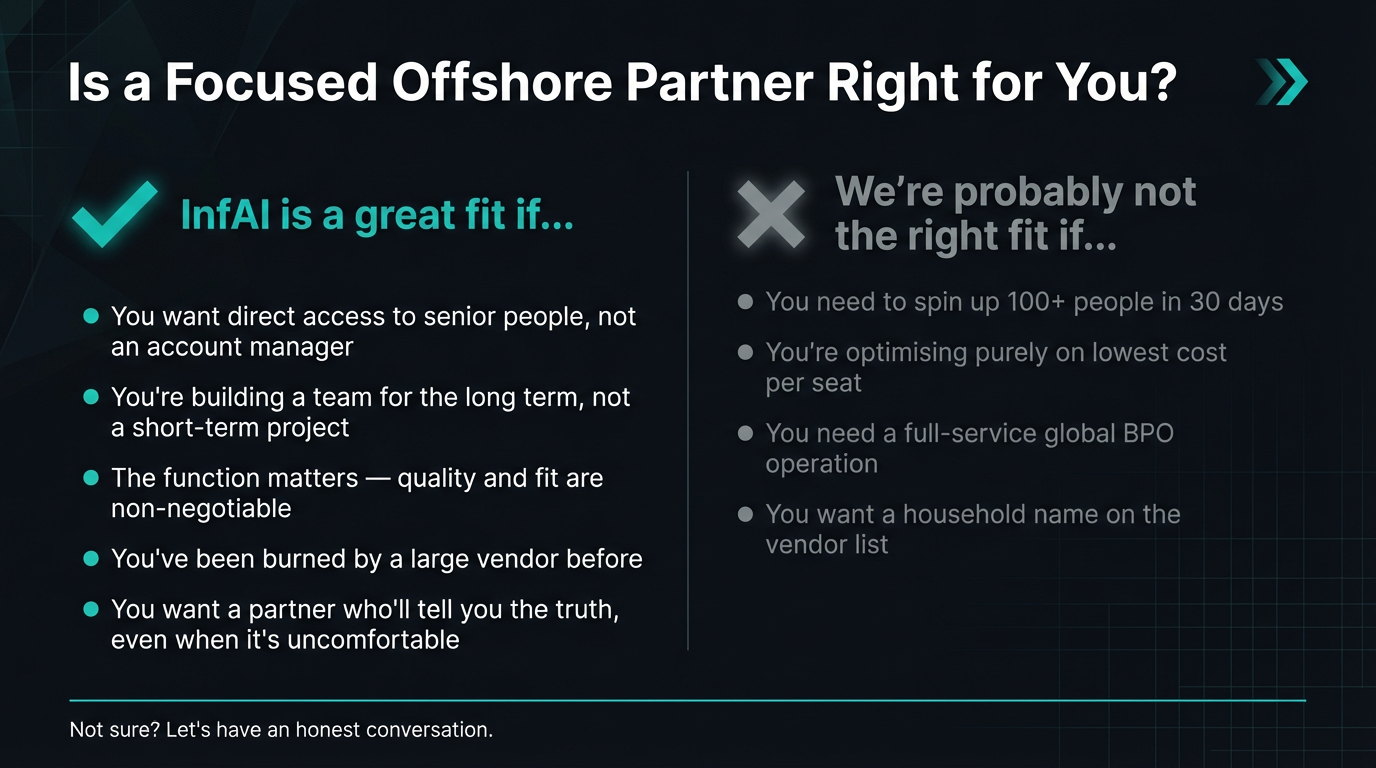 It's worth being fair here. Large offshore firms exist because they solve real problems at scale. If you need to stand up a 200-person operation in 60 days, there are only a handful of partners in the world who can do that. The infrastructure, the compliance expertise, the recruitment machinery — these things take years and capital to build.