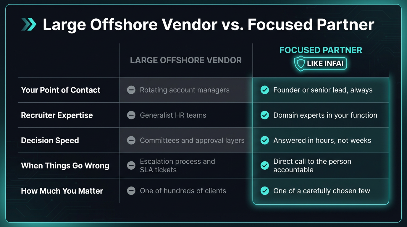 - 3A focused, founder-led offshore partner gives you something no large firm can: direct access to the people accountable for your results, recruiters with genuine domain expertise, and decisions made in hours, not weeks.